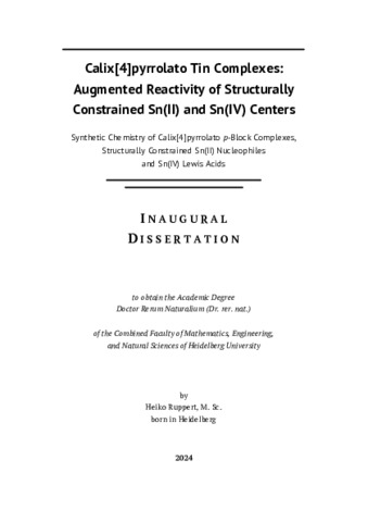 The macrocyclic, tetraanionic meso-octaalkylcalix[4]pyrrolato ligand delivered the first tetraamido stannate(II) dianion [2Et]2−. Coordination of four nitrogen pi-donors constrained into a square-pyramidal environment pushed the energetically buried electron lone pair at Sn(II)to an extreme sigma-donor capacity surpassing those of electron-rich carbene and phosphine ligands. The increased nucleophilicity of [2Et]2− even allowed the direct substitution of hydride from benzaldehyde (Section 3.1). Investigation of meso-substituent and ligand conformation effects on the electronic structure of [2R]2− (R = Me, Et) enabled the fine tuning of their donor and reducing strengths (Section 3.2).