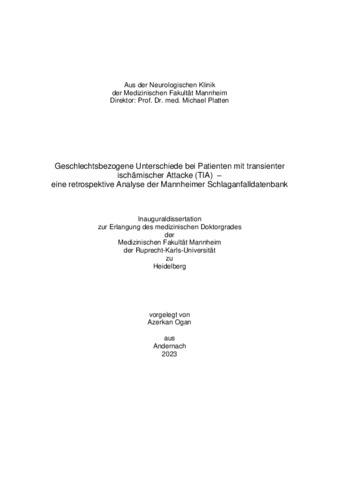 Material und Methoden: Im Rahmen dieser retrospektiven Analyse wurden die Daten von 1965 Patienten mit der Entlassdiagnose TIA (ICD G45.X), die im Zeitraum von 2004 bis 2020 auf der Schlaganfallstation des Universitätsklinikums Mannheim behan-delt wurden, analysiert. Folgende Variablen wurden geschlechtsspezifisch erfasst: Al-ter, prämorbides Funktionsniveau, Funktionsniveau bei Entlassung, Symptomdauer, Symptomcharakter sowie Wohn- und Versorgungssituation.
