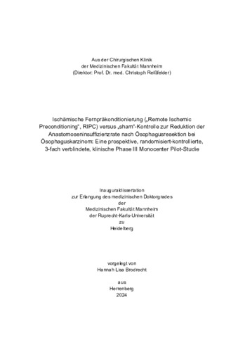 Die Ösophagusresektion, als zentrale Therapie des Ösophaguskarzinoms, gilt als einer der komplexes-ten viszeralchirurgischen Eingriffe mit einer Komplikationsrate von bis zu 60 %. Dabei stellt die Anasto-moseninsuffizienz mit einer Inzidenz von 0 – 49 % eine der häufigsten und gefürchtetsten Komplikatio-nen dar. Akut kann sie lebensbedrohliche Sekundärkomplikationen bis hin zur Sepsis mit tödlichem Multiorganversagen nach sich ziehen. Auch langfristig leiden Patient*innen nach einer AI häufiger unter einem schlechteren funktionellen Outcome und geringerem Langzeitüberleben. Ischämische Verhält-nisse im Bereich der Anastomose sind eine der Hauptursachen für die Entwicklung einer Nahtinsuffizi-enz. Ischämische Fernpräkonditionierung (engl. Remote ischemic preconditioning, RIPC) ist eine expe-rimentelle Methode zur Reduktion von Ischämie-Reperfusions-Schäden. Dabei werden an einem vom Zielorgan entfernten Organ („remote“) vor Eintritt des schädlichen ischämischen Ereignisses („pre“) kurze Zyklen von nicht-schädlichen ischämischen Reizen induziert. Dadurch werden körpereigene Wirk-mechanismen ausgelöst, die die Resilienz des Zielorgans gegen Ischämie-Reperfusions-Schäden er-höhen. Diese protektive Wirkung konnte bereits an verschiedenen Organsystemen gezeigt werden. Diese Studie untersuchte als erste randomisiert kontrollierte dreifach verblindete Pilotstudie RIPC zur Reduktion der Anastomoseninsuffizienzrate innerhalb von 90 Tagen postoperativ bei Patienten nach onkologischer Ösophagusresektion. Als sekundäre Endpunkte wurden die postoperative 90-Tage-Mor-bidität und -Mortalität nach Clavien-Dindo sowie die Krankenhausverweildauer untersucht. Zudem er-folgte die Analyse der Patientensera auf HMGB1 sowie VEGF. Von Dezember 2019 bis Februar 2022 wurden 55 Patient*innen im Rahmen der Studie untersucht. Die Anastomoseninsuffizienzrate war in beiden Gruppen vergleichbar (RIPC n = 9, 32 %; vs. Kontrolle n = 9, 35 %; p = 0,847). Die Diagnose der Anastomoseninsuffizienz erfolgte in der RIPC-Gruppe im Median fünf Tage später als in der Kontrollgruppe (RIPC 9 (4 - 23) Tage vs. Kon-trolle 4 (2 - 10) Tage, p = 0,013). Der Schweregrad der Anastomoseninsuffizienz, die postoperative 90-Tages-Morbidität und Mortalität sowie die Krankenhausverweildauer zeigte keine signifikanten Unter-schiede zwischen RIPC- und Kontrollgruppe. Lediglich die Dauer der intensivmedizinischen Versorgung war in der RIPC-Gruppe im Median um 38 Tage kürzer als in der Kontrollgruppe (RIPC n = 5, 1 (1 - 13) Tage vs. Kontrolle n = 5, 39 (11 - 44) Tage, p = 0,021). Die Analyse der Patientensera auf VEGF und HMGB1 ergab keine signifikanten Unterschiede. Als Pilotstudie erwies sich die Durchführung der Studie als gut machbar. Es konnten keine Komplikationen in Zusammenhang mit der Studienintervention iden-tifiziert werden. In Zusammenschau könnte das spätere Auftreten der Insuffizienz sowie die Verkürzung der intensiv-stationären Versorgung Hinweis auf einen - zumindest vorübergehenden - protektiven Effekt von RIPC geben. Aufgrund der kleinen Fallzahl der Studie sind die Ergebnisse jedoch vorsichtig zu beurteilen. Eine Empfehlung zur klinischen Anwendung von RIPC kann anhand dieser Studie nicht getroffen wer-den. Eine Vielzahl an Faktoren wird diskutiert, die Mechanismen von RIPC zu beeinflussen und das Ausbleiben signifikanter Ergebnisse auch an anderer Organsysteme trotz positiven Tiermodelstudien zu begründen. Weitere Studien sind nötig, um potenzielle Störfaktoren von RIPC zu analysieren sowie die Dauer und Anzahl der RIPC-Zyklen mit der größten Effektstärke zu evaluieren. Erst dann ist eine multizentrische Studie sinnvoll, um die Effekte von RIPC auf die Anastomosenheilung bei Ösophagus-resektionen erneut zu untersuchen.