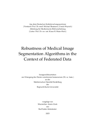 Radiology is at the forefront of adopting artificial intelligence (AI) solutions in clinical practice because the steadily increasing need for examinations based on medical imaging exceeds the growth in the human workforce. Semantic segmentation is an important component of image analysis pipelines, including applications in computer-aided diagnosis, radiation therapy planning, and disease monitoring. Nowadays, deep learning (DL) algorithms can perform automatic segmentation of various anatomical structures based on appropriately annotated training datasets. However, these algorithms do not work perfectly and can especially make mistakes when applied to data that has different characteristics than the data the models were trained on. The discrepancy between training and testing data characteristics is called distribution shift and frequently occurs when deploying models in new hospitals. In this thesis, benchmarks were developed for methods that improve the robustness of segmentation methods to such distribution shifts. Two complementary approaches were studied here: Methods that improve the out-of-distribution generalization directly or methods that know when they are wrong (failure detection). Generalization methods were benchmarked in this thesis by organizing an international competition, also known as a challenge. Such challenges are the gold standard in medical image analysis for comparing state-of-the-art algorithms, due to their standardized, fair conditions for all participants. While many competitions are organized each year, they usually use research datasets that originate from a small set of institutions and scanners. Therefore, it is unknown how well algorithms generalize to more diverse multicentric data with distribution shifts that arise in the real world. This thesis introduces the idea of using federated data in the competition setting, which lowers the hurdles for contributing data significantly, as the data does not leave the institution where it was acquired. To perform a federated evaluation, the segmentation algorithms are sent to the institutions in the federation, and results on their performance are communicated back for analyzing the robustness. The concept of federated evaluation benchmarks was implemented here in a competition for the task of brain tumor segmentation, the Federated Tumor Segmentation (FeTS) Challenge. As the first federated challenge conducted so far, the FeTS Challenge revealed and partially addressed practical hurdles associated with federated evaluation, notably the high organizational effort, the increased difficulty of annotation quality control compared to conventional challenges, and the constraints on the challenge analysis due to the lack of direct access to federated data. However, it also highlighted the potential of federated benchmarks to boost the dataset size and diversity considerably, exemplified by the testing dataset of the FeTS Challenge, to which 32 international institutions contributed 2625 cases with multi-parametric magnetic resonance imaging (MRI) scans. Evaluating the 41 segmentation models submitted to the competition on the test data showed that they obtained good average-case generalization, but also a lack of worst-case robustness on 13 of the 32 institutions. Failure detection is important for the reliability of segmentation methods in practice, so it has been studied from many perspectives, including uncertainty estimation, out-of-distribution detection, and segmentation quality estimation. Progress in method development is currently hindered for two reasons: The evaluation protocols used by the above approaches differ, making cross-comparison of methods towards the same goal of failure detection difficult. Furthermore, novel methods have often been evaluated only in a single segmentation task (anatomical region) or not considering distribution shifts, which leaves questions about their generalizability unanswered. Therefore, the second part of the thesis addresses these shortcomings, by developing an evaluation protocol based on a risk-coverage analysis, which allows comparing all relevant methods in failure detection while avoiding pitfalls in current practice. A benchmark was designed that implemented the proposed evaluation and compared several, diverse failure detection methods in experiments with multiple public datasets that contain realistic distribution shifts. The benchmark results provided insights into how uncertainties on the pixel level can be effectively aggregated into image-level uncertainties for failure detection. Moreover, an existing, simple method was identified as a strong baseline for future research, as it consistently outperformed more complicated algorithms across datasets. Due to its flexibility and efficiency, it can be easily adapted to new segmentation tasks and practical applications. In conclusion, large-scale benchmarking studies were conducted in this thesis, which test state-of-the-art generalization and failure detection algorithms in scenarios that simulate performance in real-world deployments. The experiments demonstrated how to employ multicentric data in centralized and federated form for evaluating robustness to distribution shifts, revealing common failure sources, and identifying practical algorithms that are able to generalize to new hospitals and abstain from uncertain predictions. The code for both benchmarks is made available to the community to foster meaningful method comparison and progress in robust medical image segmentation algorithms.