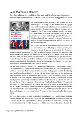 English Title: “From Marcos to Marcos”: A review of the anthology edited by Rainer Werning and Jörg Schwieger on the history and politics of the Philippines since 1965