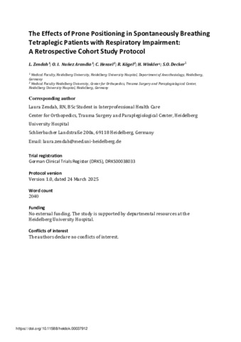 Methoden: Diese retrospektive Kohortenstudie analysiert routinemäßig erhobene klinische Daten von spontan atmenden tetraplegischen Patienten, bei denen am Universitätsklinikum Heidelberg eine Bauchlagerung durchgeführt wurde. Parameter wie Sauerstoffsättigung (SpO₂), arterielle Blutgase, Atemfrequenz und Sekretmobilisation werden vor, während und nach der Bauchlagerung erfasst. Eingeschlossen werden Daten aus dem Zeitraum vom 10. Juli 2017 bis zum 28. Februar 2025. Die statistischen Analysen umfassen sowohl deskriptive als auch inferenzstatistische Verfahren, die für gepaarte Daten geeignet sind.