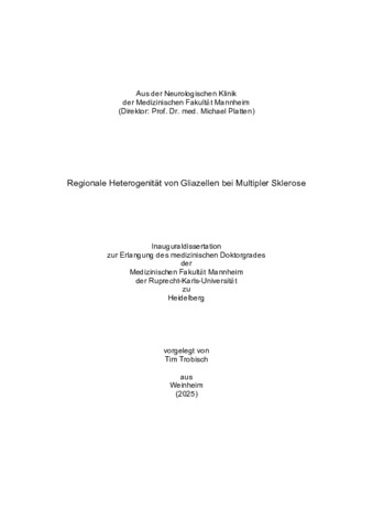 Die Multiple Sklerose (MS) ist eine chronisch-entzündliche Erkrankung des zentralen Nervensystems (ZNS), welche sich durch entzündliche Demyelinisierung und Neurodegeneration auszeichnet. Regionale Unterschiede der Pathologie sind bislang nur unzureichend verstanden. Ziel dieser Dissertation war die Untersuchung der regionalen Heterogenität von Gliazellen in verschiedenen ZNS-Regionen bei MS. Hierfür wurden postmortale humane Gewebeproben mittels Einzelkern-RNA-Sequenzierung und histopathologischer Analysen untersucht. Es zeigte sich eine ausgeprägte regionsspezifische Diversität von Astrozyten- und Oligodendrozytensubtypen sowie gemeinsame und regionsspezifische transkriptomische Veränderungen bei MS. Astrozyten wiesen heterogene reaktive Signaturen auf, während Oligodendrozyten teilweise promyelinisierende Profile zeigten. Die Ergebnisse verdeutlichen die zentrale Bedeutung der regionalen glialen Heterogenität für die MS-Pathophysiologie und liefern Ansatzpunkte für neue, regionsspezifische therapeutische Strategien.