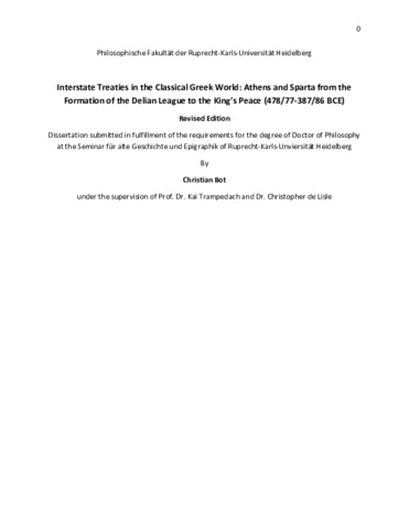 This dissertation investigates the historical development of interstate treaties in the Classical Greek world from the formation of the Delian League up to the King’s Peace with a particular focus on the hegemonic powers of the era, Athens and Sparta. The study analyzes a large collection of individual treaties in their historical and diplomatic context in order to investigate how the treaties influenced and were influenced by the geopolitical shifts of the fifth and early fourth centuries BCE. The dissertation also examines six critical dimensions of treaty-making: terminology, negotiation processes, duration, publication practices, religious rituals, and the evolving concept of autonomy. Through a combined chronological and thematic approach, the work argues that treaties were active agents in historical change rather than mere reflections of military outcomes.